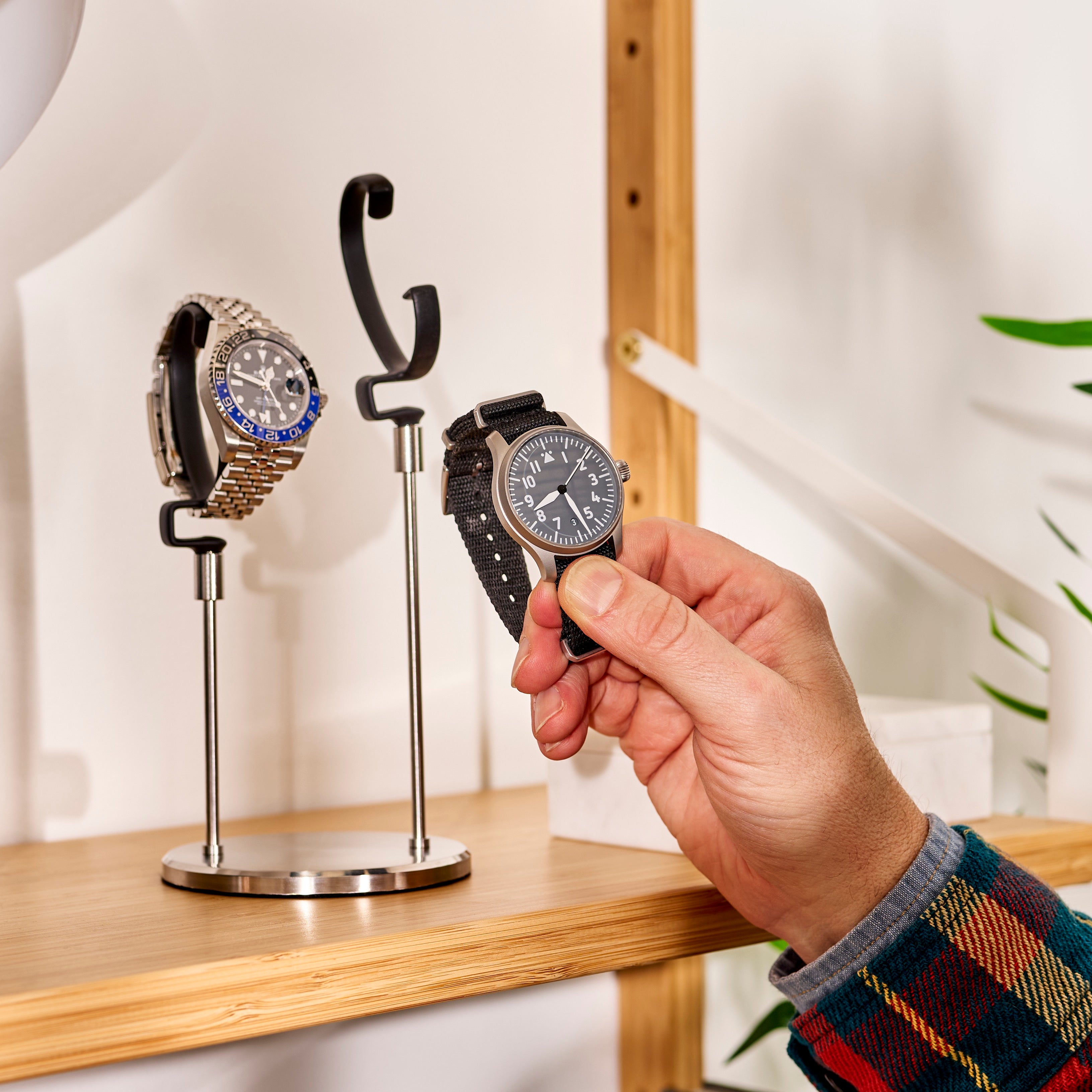 A stainless steel base with polished chamfers and sunburst finishing sits on a felt pad and can be securely placed on any flat surface without leaving scratches. Weighing in at a robust 0.9 lb (Two Watch Collection) and 1.6 lbs (Three Watch Collection), it's sturdy enough to withstand knocks from the paws of passing cats or children. This tapers to stainless steel stems, thin and elegant yet deceptively strong. Your watches fit snugly over the rubber-coated C-clips at the top, which hold them firmly yet invisibly, allowing your watches to be viewed in all their glory from any angle.